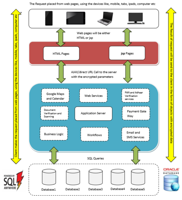 The web application development includes three level architecture. The application web pages will be html or jsp. Using the user friendly themes for the web pages design, which can access from any type of devices. Client can access the same in their devices by calling the respective URL. The request can be made through the pages to the server. For HTML pages we are using AJAX methods and the jsp pages through servlets. In both cases the communication will be propelry encrypted. Once the request made, the application server will be executing the business logic.